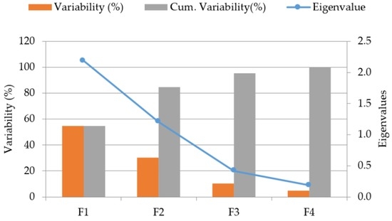 Figure 8 shows the PCA model constructs for sediment yield. The sediment yield model extracts two PCA components with eigenvalues ≥1 (Figure 8) based on four predictor variables (i.e., forest, urban, rangeland and agriculture). The models were constructed satisfying the requirements of Bartlett’s test of sphericity (df = 6; p < 0.05), Kaiser-Meyer-Olkin (KMO) measure of sampling adequacy (KMO = 0.60) and determinant of 0.21. The first component explained 54.6% of the variability observed in the sediment yield (Figure 8). The addition of the second component cumulatively explained 84.7% of the variation in sediment yield resulting from individual LULC changes. The second component therefore explained 30.1% of the total variance in sediment yield. The inclusion of more models resulted in no significant improvement of the percentage variance explained (Figure 8). This implies that variation in sediment yield is influenced by two loading components. The first component of the sediment yield model (Table 8) was dominated by agriculture and urban on the positive side and forest on the negative side. In consideration of the second component, agriculture and urban land uses were dominant with both on the positive side.
