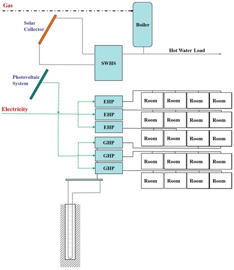 Both EHPs and GHPs are installed to supply the heating/cooling loads of classrooms. They are not combined but operated separately. Therefore, a classroom is supplied with energy from either an EHP or a GHP. The electricity required for operating both heat pumps is provided from PVs or the electrical grid (when the supplying from PVs is insufficient). When the energy from the solar collectors cannot meet the hot water load, the deficit is compensated by a gas boiler. The storage tanks were not taken into account in this study. Gas is consumed by the boiler and can be reduced by increasing useful energy gain from the solar collectors.
