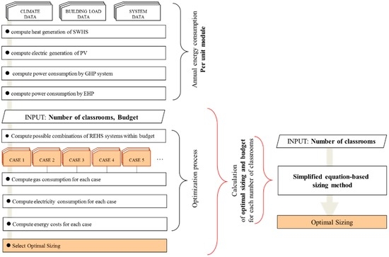 Figure 6a. This process requires a large amount of computational time as a large number of simulations for possible REHS combinations have to be run. Therefore, in the following section, a simplified method that calculates the optimal sizing of the REHS components is proposed (