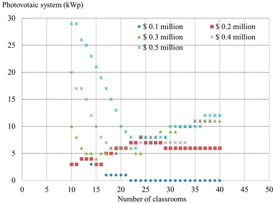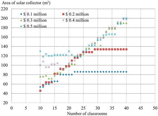 In addition, similar to the solar collector cases, in cases of excess budgets, for example, the $0.5 million case for 10–23 classrooms, the points must be removed because the budget is far more than an optimal investment.