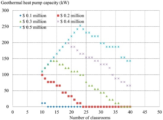 Figure 8. The pattern is different from the solar collector case. For each budget, the system capacity decreases as the number of classrooms increases. When the number of classrooms and the consequent load increases, an investment in other RE systems is preferred instead of further GHP installation. This is because the gas rate is more expensive than the electricity rate for education facilities in Korea. Thus, an investment that reduces gas boiler operations is a better solution for reducing running costs.