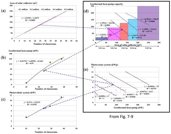Figure 9 by simply superimposing the SWHS, GHP, and PV sizing results via the number of classrooms. Therefore,
