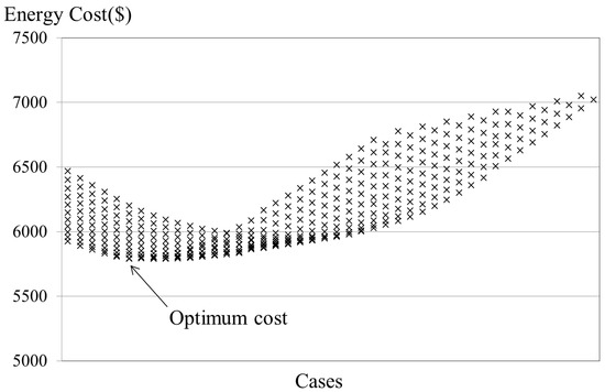 This figure also shows that the REHS sized by the proposed simplified method results in the lowest operation cost under the given REHS budget. All the possible combinations of the REHS were investigated for the figure. Consequently, there may be no need to run intensive inter-comparison simulations with an existing optimization tool.