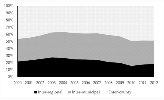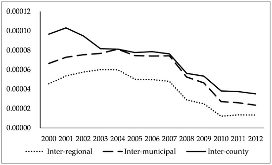 Contribution of the scale variance of regional inequality at different scales, 2000–2012.
