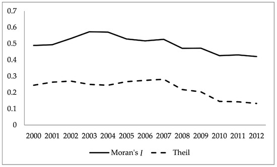 Global Moran’s I and Theil index of county-level per capita GDP, 2000–2012.