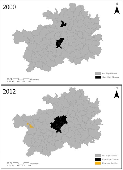 Local indicators of spatial association (LISA) of county-level per capita GDP in Guizhou Province in 2000 and 2012.