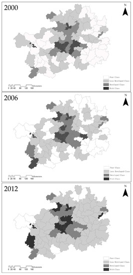 Comparing the spatial distribution of county-level per capita GDP in Guizhou Province in 2000, 2006 and 2012, a degree of economic spatial agglomeration gradually formed in the province with Guiyang City at its core (Figure 7). The regions of the rich type spread from Guiyang City to the surrounding areas with a scattered distribution. The core area in central Guizhou exhibited spatial concentration because of the growth effect.