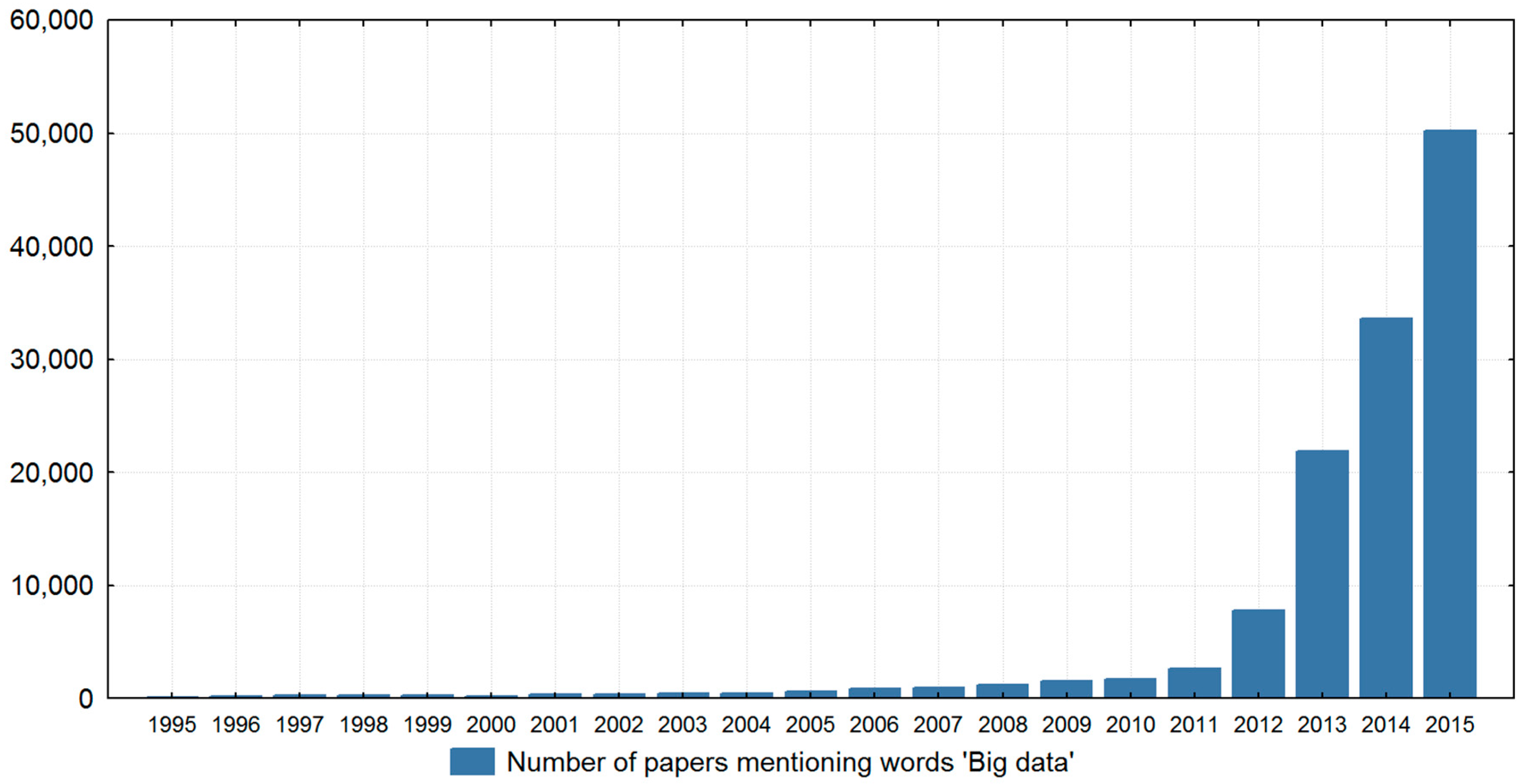It is a fact that at the beginning of this century the amount of data then available in the entire Internet equals to what is now created in a single second. Mobile phones, social networks, surveys, bank card payments, Global Navigation Satellite Systems (GNSS), online activities, public transport ticketing, location-based services, etc. all produce torrents of data as a by-product of their operations. Comparing the amount of data generated in 2011 with its growth and global population size [1], it is estimated that on average each person produces 1 GB of content daily. This huge data stream initiated revolution is being referred to as big data. The term big data is used as a general term for referring to data sets so large and complex that traditional data processing applications are no longer adequate. This fundamental change of going from a data-scarce to a data-rich environment seems to infer a shift from relatively “small data” studies aimed to answer specific questions based on sampled data to “big data” studies that aim at probing for relationships and correlations between a wide series of variables and contexts [2]. Big data is often typified by the so-called 3Vs definition [3]. The three Vs define big data as the increase of volume (data scale becomes increasingly big), variety (data come as structured, semi-structured and unstructured data) and velocity (data collection-processing chain needs to be promptly and timely conducted to maximally utilize the potential value of big data). Over time, gleaning intelligence from data proved itself to be a key element that differentiates between, simply, large data amounts and big data itself. In evidence of this is the growing body of scientific literature on this topic that is exhibiting exponential growth over the last five years (Figure 1). Thus, the original definition evolved towards 4Vs [2,3,4,5], which is the most used today. In the 4Vs definition, original velocity was divided into velocity and value, highlighting the extraction of value from data as one of the main big data characteristics. Hence, the 4Vs stand for volume (great volume), variety (various types of data), velocity (swift generation), and value (huge information value with very low density concealed among data). Companies that have, at early stage, recognized this potential demonstrate a strong role that data driven insights have in gaining business advantage. Many examples of this, such as Amazon [6] or Google [7], are well known today [8,9]. As the availability of data to measure the system performance and consumer behaviour is strongly influencing the level of knowledge about their businesses and consumers, managers are able to directly translate that knowledge leads to improved decision making and performance. This makes their business more agile and resilient, while facing upcoming challenges.