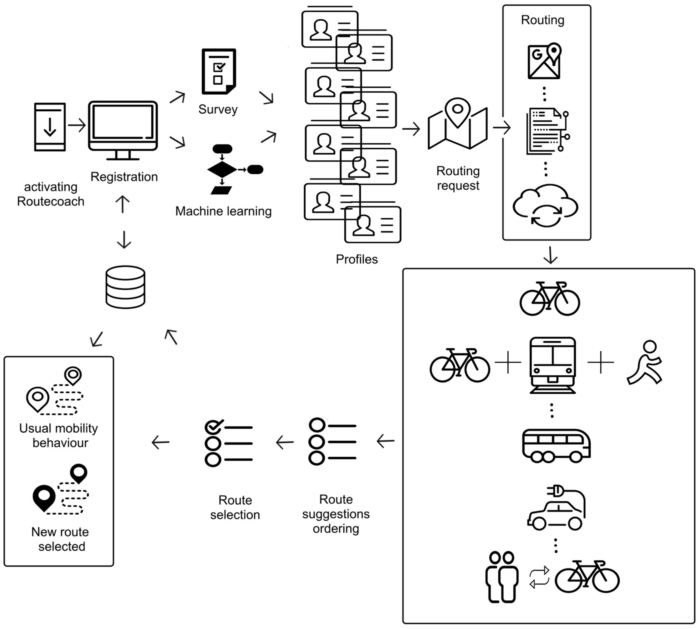 Participants of the sustainable mobility campaign were able to complete the Segment project’s survey as a part of registration process while activating their Routecoach application. Based on the results of this survey: (i) for users who completed the survey, one of the eight sustainable mobility profiles was assigned; and (ii) for users who did not complete the survey, the machine learning based approach with success rate of 98% (described in detail in Semanjski and Gautama [51]) was applied to map their crowdsourced behaviour to the profiles and thus to assign the profile to the user. This way, from regional context and observed behaviour, Segment profiles were mapped to wider population. For each homogeneous subgroup, personalised route coaching was designed. This meant that every time a user would reach towards routing option of the app, the app would integrate routing information from multiple sources (e.g., regional public transport company, national rail company, Google maps, etc.) to determine feasible routes by one transport mode (e.g., car, train or bike route), but also to produce feasible multimodal routes (e.g., bike-train-foot route). All feasible routing options were evaluated based on the comfort levels and preferences of each of the profiles. This resulted in displaying the five best options to the user in personalised order and with respect to the route sustainability (e.g., car route could never be the first one). Thus, every time a user would look up for the routing information, the respond (s) he would get was personalised routing incentive challenging him, or her, to consider more sustainable route option. Furthermore, the campaign participants would, by selecting the route, generate a feedback on routes they were considering and the one they would select for their journey. This feedback would also be confirmed based on the app’s route tracking option (collected GNSS route points and timestamps). In addition, the campaign involved development of dedicated web portal [45]. The portal served for user registration during which the users were asked to indicate, through the geographic information system (GIS) interface, their usual routes and transport modes they utilize for these routes. Generated indications served, in future data analytics steps, as a ground truth when determining whether actual undertaken routes correspond to the participant’s usual mobility behaviour or not (Figure 2).