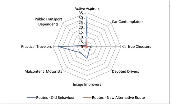 Regarding the CO2 emissions, the highest reduction of the CO2 emissions per trip was noticeable for the Devoted Drivers (a bit more than 2538 g) while the Practical travellers produced 45 g of CO2 more per trip than usually (Figure 5). Potential reason for this is seen in fact that, when choosing a route, Practical travellers are not predominantly concerned by environmental issues, but by personal feeling of convenience. In this sense, when considering all the available mobility options, they personally prefer faster and cheaper transport modes (Table 2). Thus, geographical distribution of their preferences for car routes can provide decision makers with worthy indication about public transport, bike or pedestrian network performance and connectivity.