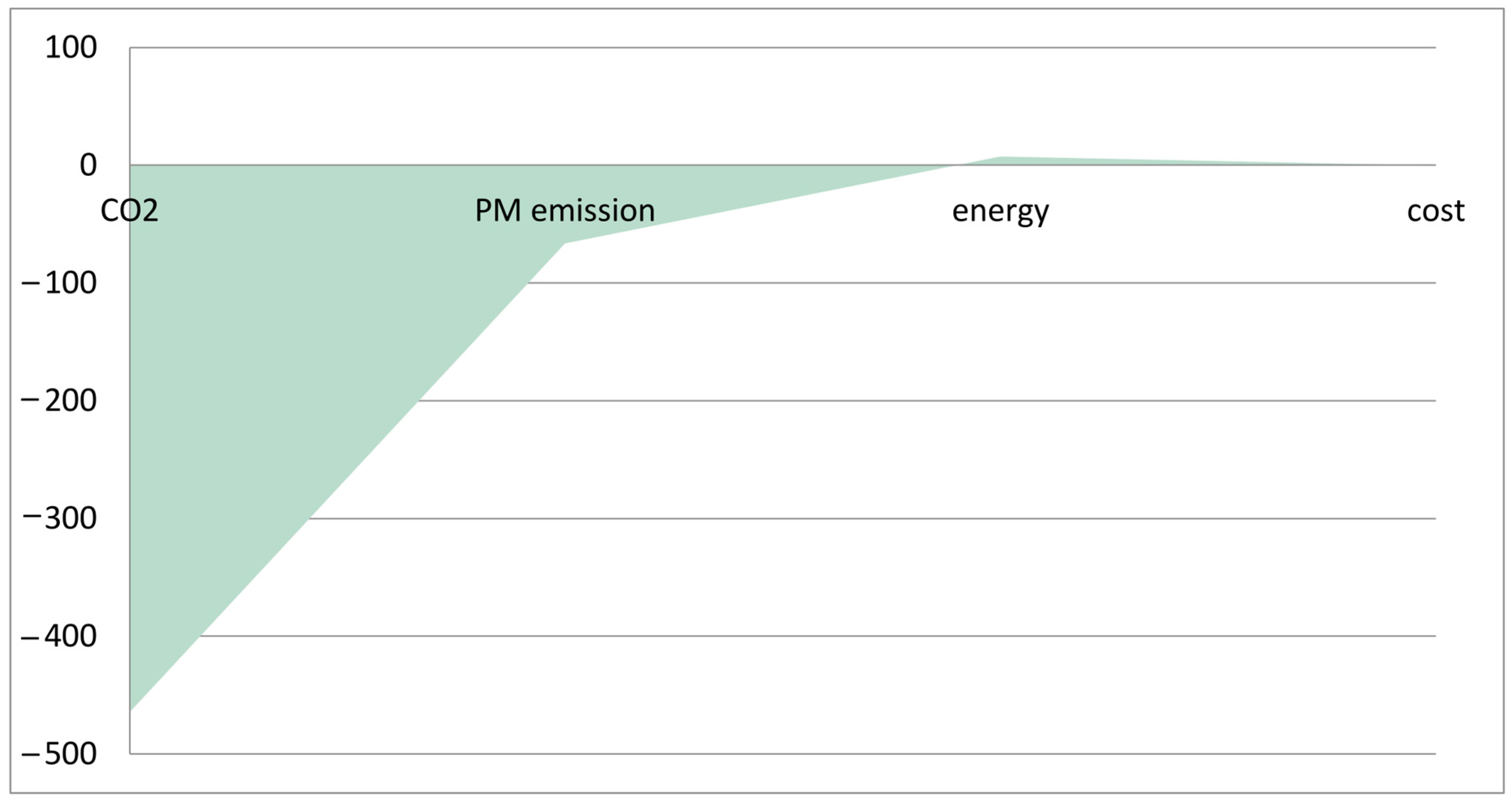 Similar effect, as for the CO2 emissions, was noticeable for the PM2.5 emissions across different attitudinal profiles (Figure 6).