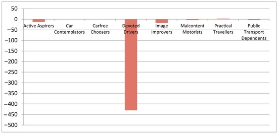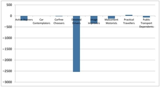 When considering all users, for 7.4% of routes they tried out new, more sustainable, route alternatives. The acceptability of this incentive varied among different homogeneous subgroups of users, reaching up to 18% for Carfree Choosers []. Compared with results from literature where traditional communication means were used to familiarize transport system users with available alternatives [] these results are on average twice higher. This highlights the potential of Policy 2.0 concept applicability. In more detail, the most prominent difference was for the CO2 emissions were, on average, for every newly tried trip suggestion CO2 emission were reduced for 465 g (Figure 4). In addition, on average, users were more active which resulted in burning 7.4 kcal more per trip than it was the case for their usual mobility behaviour. However, general statistics often hinder insights into distribution of behavioural change across different population segments. Figure 5, Figure 6, Figure 7 and Figure 8 show in more detail results for each of sustainable mobility indicators across different homogeneous population subgroups.