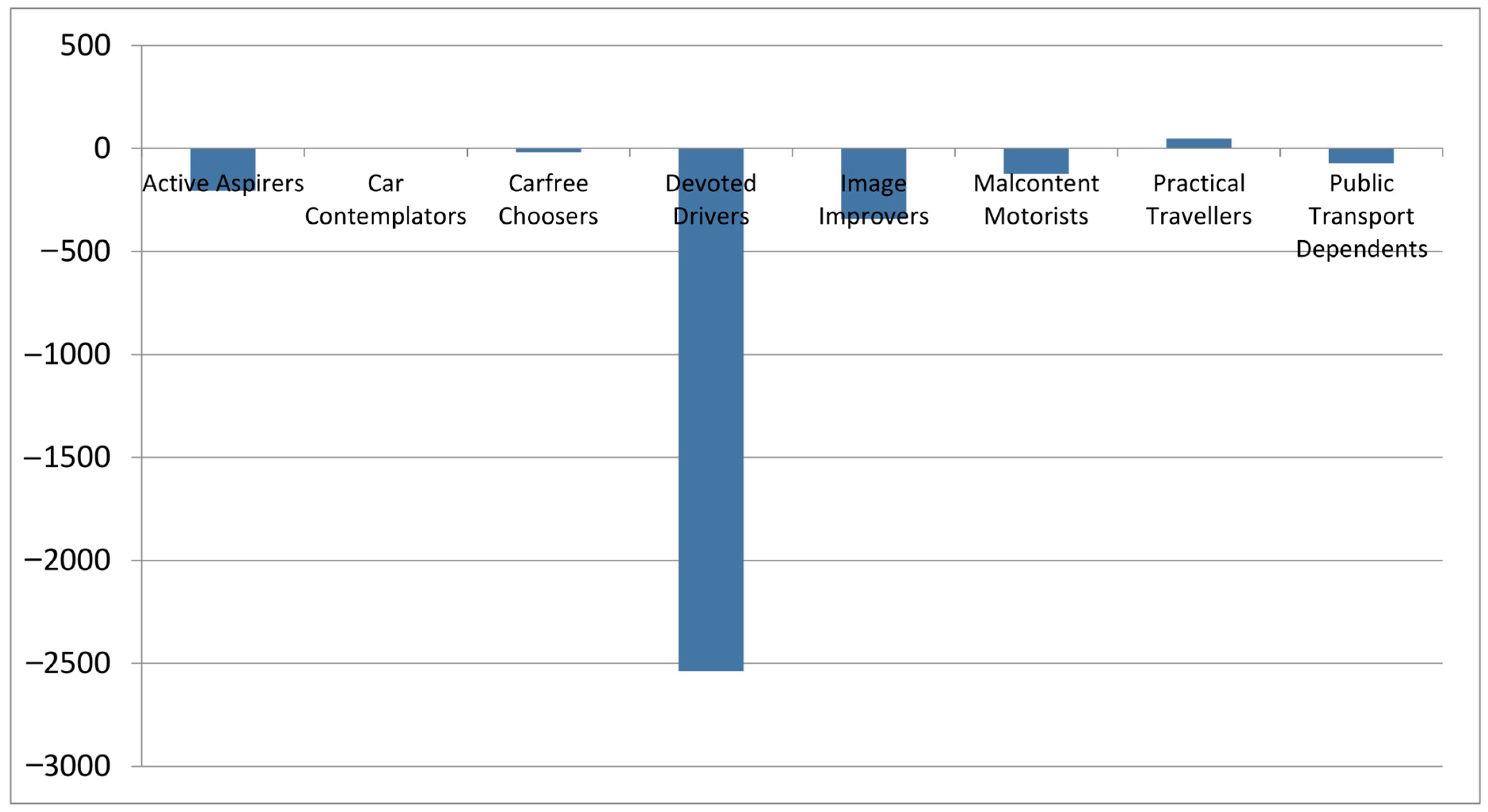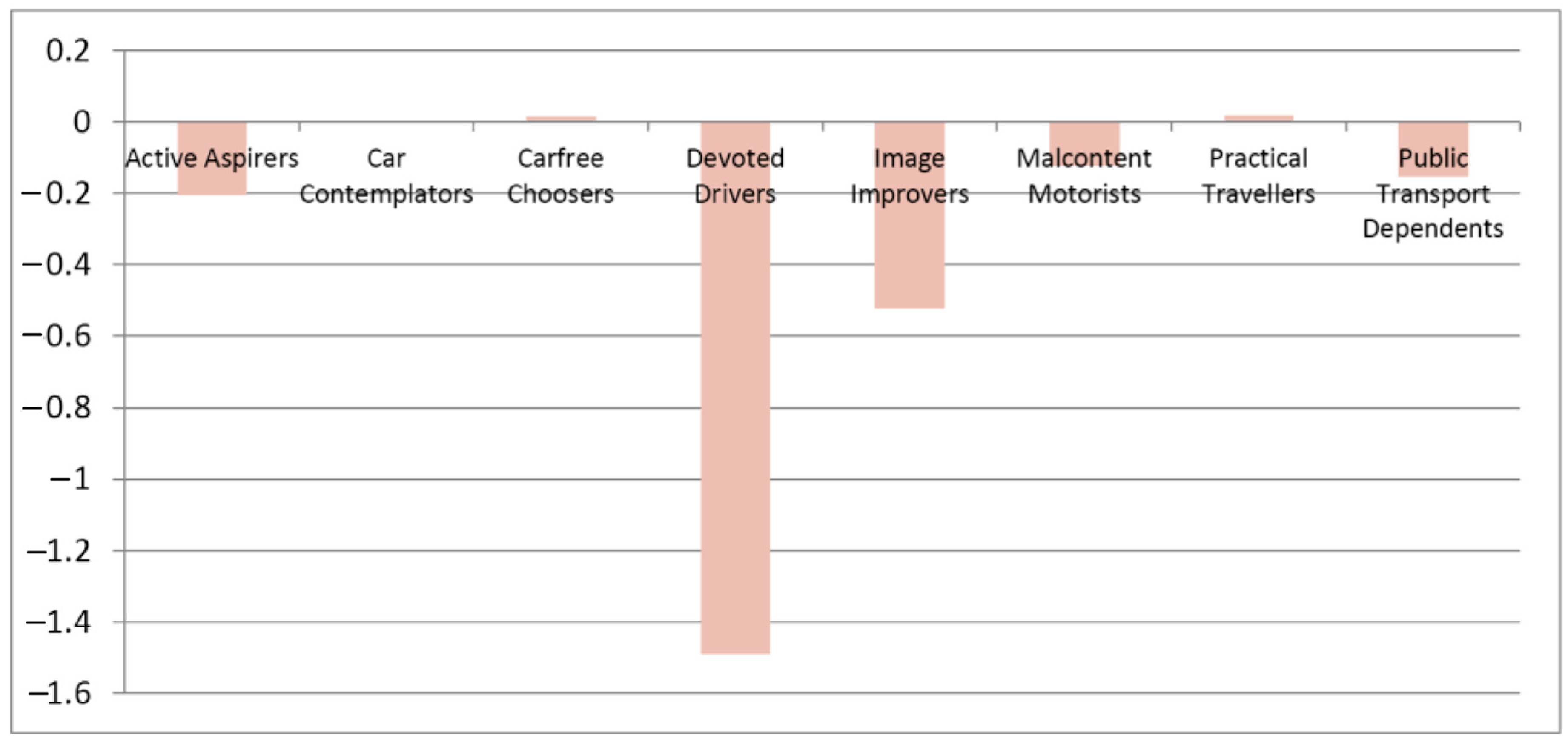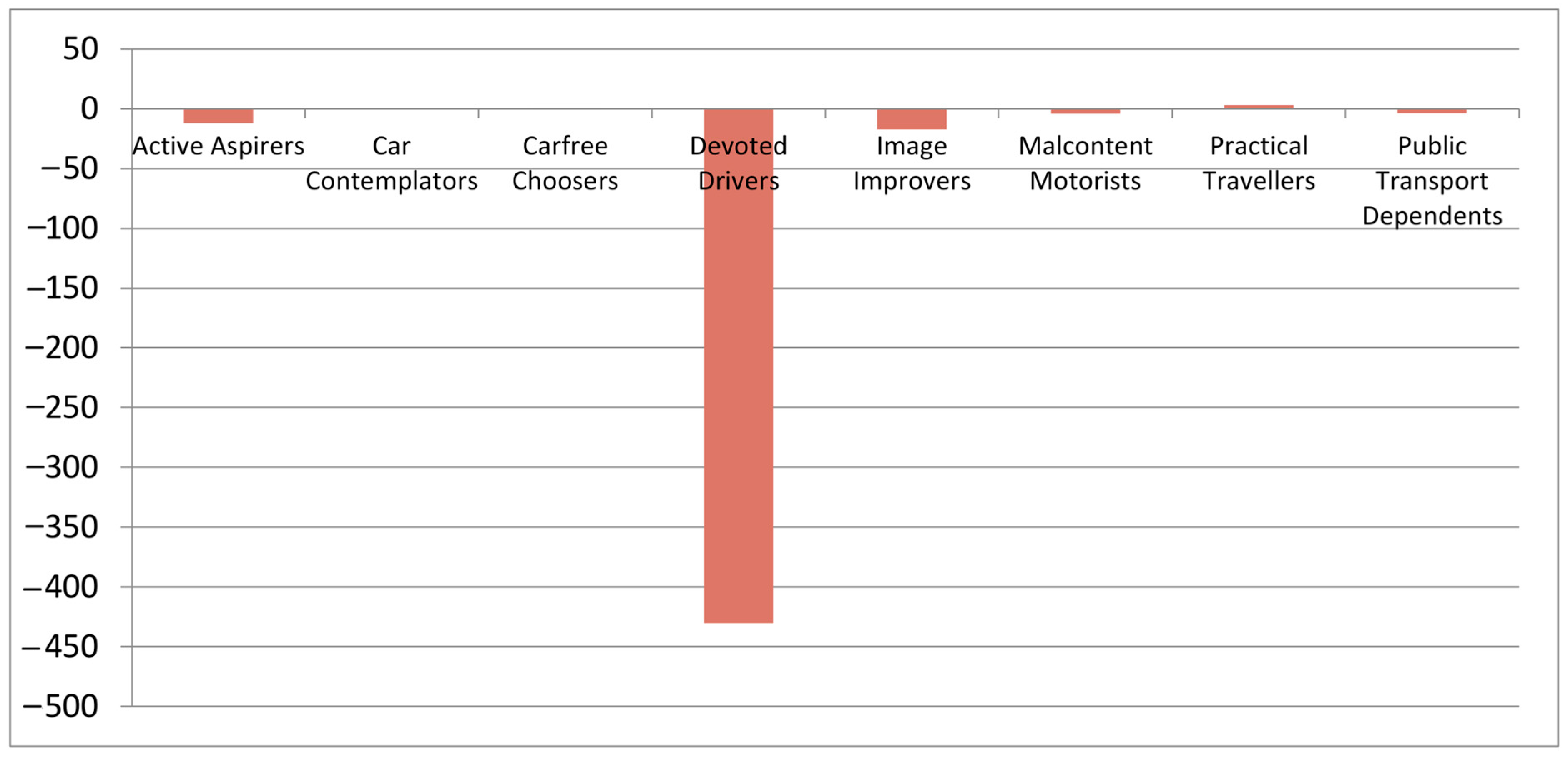 Regarding the physical activity, behavioural change effect was most prominent for the Public Transport Dependents who averagely burned 52 kcal more per trip than before (Figure 7). Increase in the level of physical activity was also noticeable for the Malcontent Motorists, Devoted Drivers and Active Aspirers. On the other hand, the Practical Travellers were most likely to change their behaviour in a way that would cause the least physical activity by them. Considering the financial savings, the Devoted Drivers profited the most from the behavioural change by saving, on average, 1.5 Euros per trip. The most pronounced change was also noticeable for other car oriented profiles, such as Image Improvers, where even small difference in mobility behaviour, as choosing shorter car routes or trying out bike and walking for shorter trips, reflected in observed financial savings. Indeed, a small financial loss, of extra 0.01 Euro per trip, was noticeable for Practical Travellers and Carfree Choosers (Figure 8). This increase in mobility budget was mainly due to replacing some active transport mode routes by public transport, while the use of private cars maintained low for these profiles.