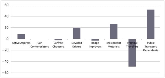 In line with this, the Segment project defined a short survey (eighteen questions) that differentiates the most between eight different user profiles []. Thus, the survey explores to which extent a person believes that sustainable mobility related choices are under his or her control (e.g., does person believes that change in his/her behaviour will have any impact on CO2 emissions reduction), what are person’s attitudes toward differed sustainable mobility options (e.g., does person finds cycling stressful or enjoyable) and what is person’s perceived social pressure related to the mobility options (e.g., does person see use of private vehicle as a way of self-expression). The complete description of survey creation, full list of questions and user profiles are described in detail in Anable and Wright [] and Ladbury []. For clarity of our study, Table 2 summarises the characteristics of each of these profiles.