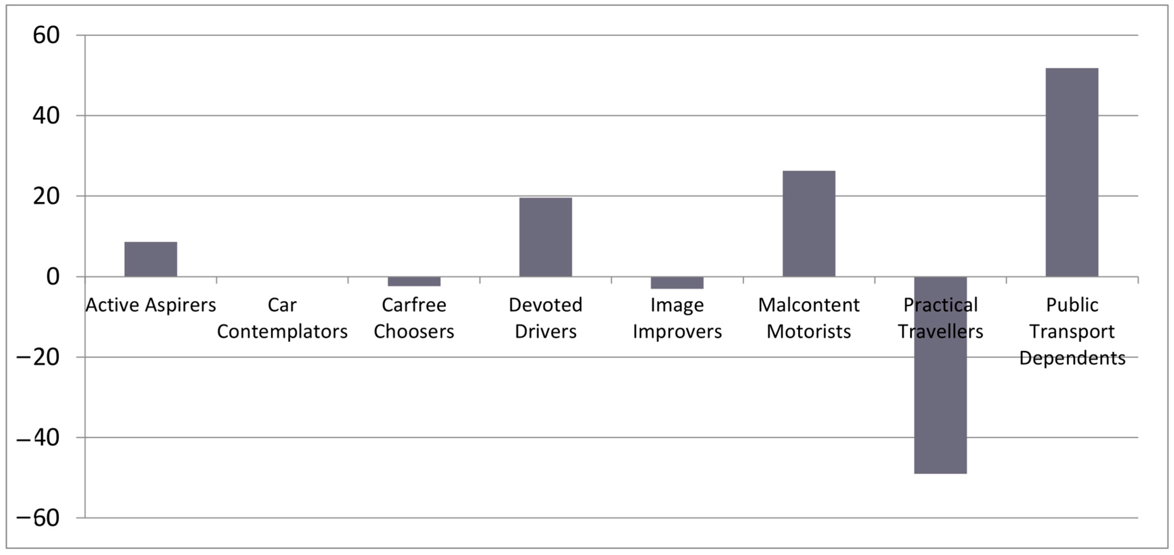 When considering all users, for 7.4% of routes they tried out new, more sustainable, route alternatives. The acceptability of this incentive varied among different homogeneous subgroups of users, reaching up to 18% for Carfree Choosers [33]. Compared with results from literature where traditional communication means were used to familiarize transport system users with available alternatives [77] these results are on average twice higher. This highlights the potential of Policy 2.0 concept applicability. In more detail, the most prominent difference was for the CO2 emissions were, on average, for every newly tried trip suggestion CO2 emission were reduced for 465 g (Figure 4). In addition, on average, users were more active which resulted in burning 7.4 kcal more per trip than it was the case for their usual mobility behaviour. However, general statistics often hinder insights into distribution of behavioural change across different population segments. Figure 5, Figure 6, Figure 7 and Figure 8 show in more detail results for each of sustainable mobility indicators across different homogeneous population subgroups.