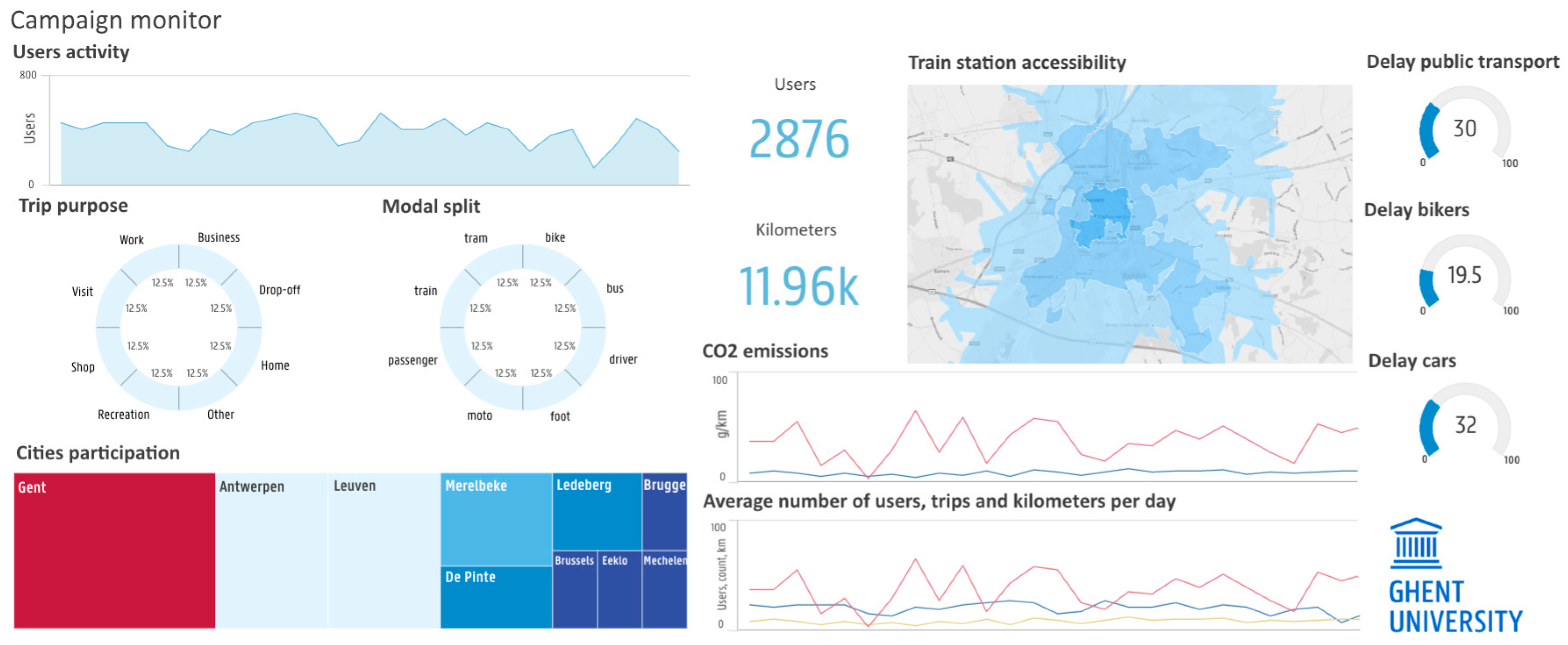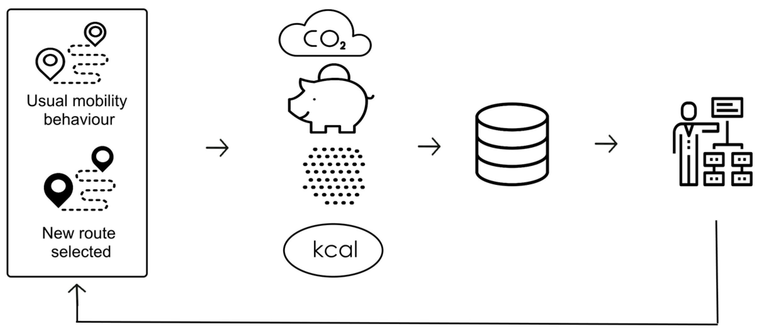 Integration of direct and derived insights into Policy 2.0 platform has two sided visibility. On one end, users, based on their user profile, can follow up on their personal mobility related statistics, such as mobility budget, but also compare themselves with aggregated values at the population, or homogeneous subgroup, level. On the other end sustainable mobility planners have insight into campaign’s participants overall mobility behaviour, which, based on the spatial and temporal resolution, they can aggregate at different levels (such as morning peak hour for certain community, or homogeneous subgroup of users) (Figure 9).