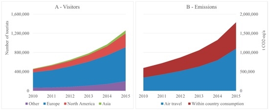 Many of the activities undertaken by the tourism sector are energy-intensive, including transport, delivering amenities and providing accommodation and other facilities for tourist needs. In many cases, this means that such tourist destinations might have greater emissions compared to other similar-sized, non-tourism-based communities [5]. Tourism also drives the construction of new infrastructure and buildings, such as hotels, further adding to the emissions intensity of the sector. Most destinations also use considerable amounts of energy for importing food and other material goods and for disposing of waste [6,7]. Aviation has also been shown to contribute significantly to overall emissions from the sector (e.g., [5,7,8,9,10,11,12]) and is often the major source of tourism-related energy use [5]. This is particularly apparent for those destinations that are isolated or island-based, where tourists overwhelmingly arrive by air [5,8]. For example, in the Caribbean islands, Gössling [13] reported that the share of emissions related to air travel was between 44% and 71% of total emissions across the region. Still, despite the increased attention being paid to tourism-induced aviation and the need to mitigate GHG emissions, significant gaps in the research exist [14]. The issue is further complicated by the fact that aviation emissions are accounted for differently across the literature with no agreement on how to best deal with them [12]. In spite of this, there is widespread consensus that this source of emissions should be included in national accounting frameworks to enable better understanding and encourage mitigation policies [12].