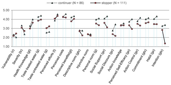 Significant differences also exist for the block of self-regulation factors. Continuers stated that they put more effort into monitoring and controlling their behavior at both surveys. While they evolve positively, action control decreases significantly for stoppers over time. Commitment to water treatment shows slight positive progress over time for both groups; however, continuers score significantly higher at both the first and the second measurements. The two groups also differ significantly in the strength of self-reported habit for water treatment. While there is no significant development over time, continuers report a much stronger habit at both surveys.