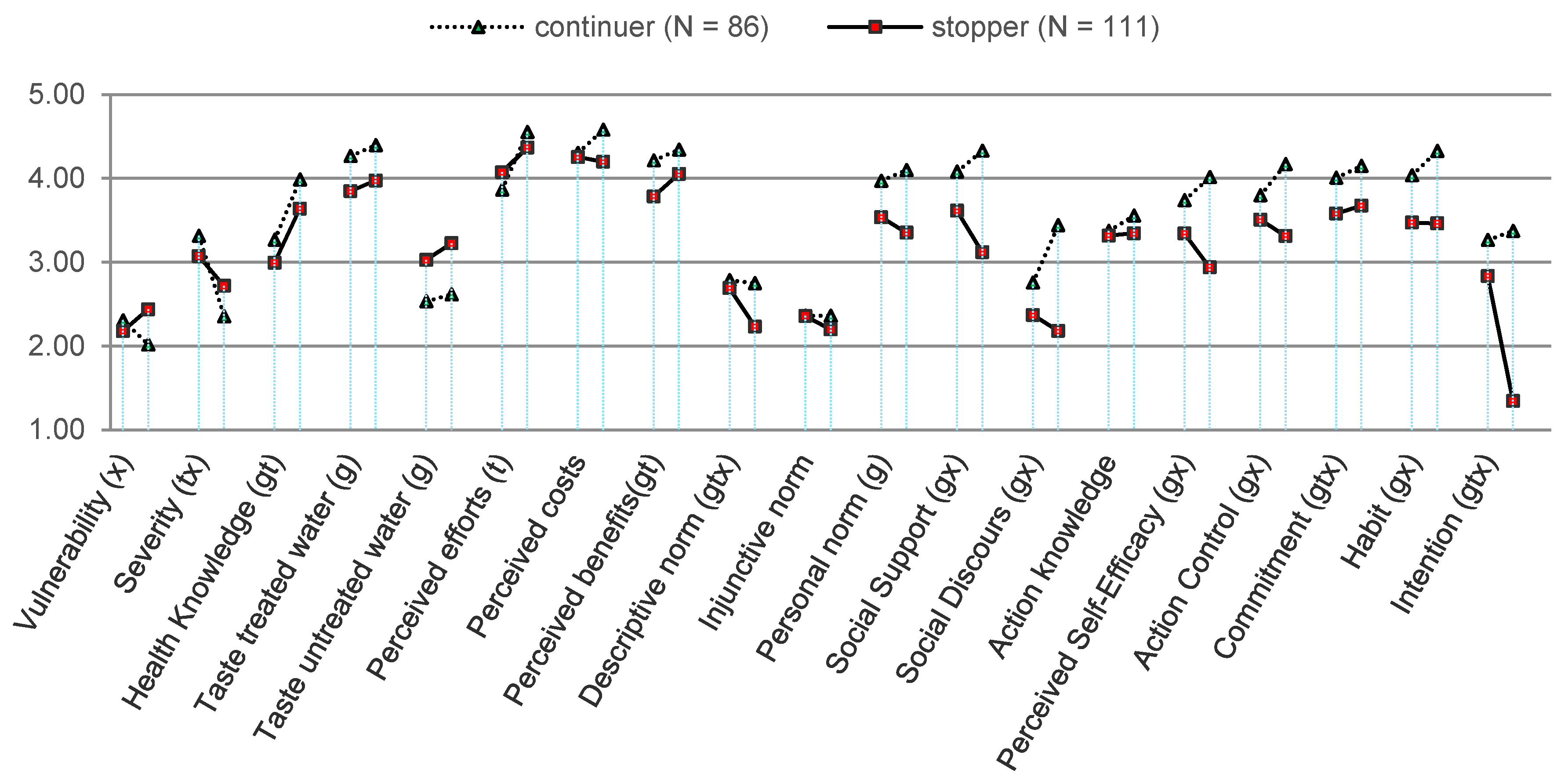 Figure 1 depicts a graphical representation of the survey results for all psychological factors, showing the mean values for the answers of the two groups of continuers and stoppers at both surveys. The scale range is 1 to 5 and all factors have been standardized and recoded so that 1 always represents the scale minimum and 5 represents the maximum possible value. Low values stand for less favorable results concerning water treatment behavior. For example, a low personal risk perception for diarrheal disease, weak social norms, and high perceived costs of drinking water chlorination are all interpreted as reducing the probability of a person performing water treatment. Higher values are more favorable for the target behavior. High perceived benefits, low costs, high social norms, and strong intention or commitment to drinking water treatment are expected to correlate with a high probability of that person performing water treatment.