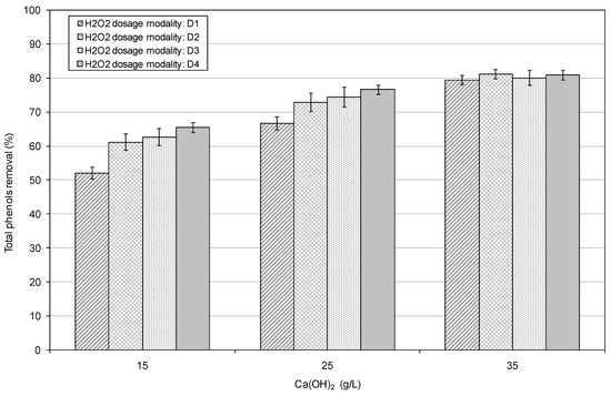 In the texts carried out with a lime dosage of 25 g/L, the sequential dosage of H2O2 produced a growth of phenols abatement from 67% to 77%, by increasing the steps for hydrogen peroxide additions. Instead, for the maximum quantity of tested lime, the modality of H2O2 addition did not cause any significant process modification (Figure 1). The lower effect of sequential peroxide dosage with the increase of lime amount is attributable to the corresponding pH increase, which clearly accentuates the oxidative power and makes less meaning the OH∙ scavenger. The abatements reached in the present study are in line with those detected by the authors using NaOH to create the alkaline conditions [31]. Moreover, similar performances are reported in other researches concerning the treatment of olive mill wastewaters. In particular, phenols removals of about 60% were obtained by Bettazzi et al. [22] with Fenton process, using doses of approximately 0.15 and 0.25 gH2O2/gCOD. Similar findings were obtained by Canepa et al. [23] and Khoufi et al. [25] by applying, respectively, photo-Fenton and electro-Fenton processes in the treatment of wastewaters of three phase production systems. Better performances were reached when hydrogen peroxide dosages, significantly greater than that applied in this study, were used [11].
