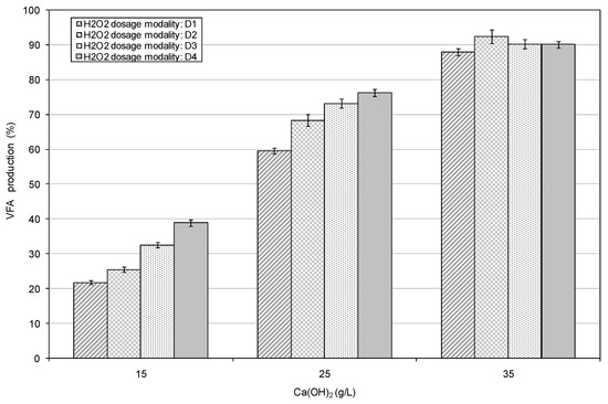 VFA productions detected in the experiments conducted by changing the lime quantity (15 g/L, 25 g/L and 35 g/L) and by dosing the H2O2 amount (0.05 gH2O2/gCOD) with four different modalities (D1: single addition; D2: two additions; D3: three additions; and D4: four additions).