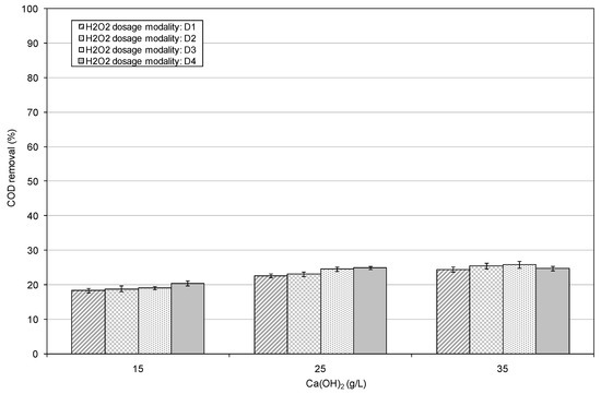 COD removals detected in the experiments conducted by changing the lime quantity (15 g/L, 25 g/L and 35 g/L) and by dosing the H2O2 amount (0.05 gH2O2/gCOD) with four different modalities (D1: single addition; D2: two additions; D3: three additions; and D4: four additions).