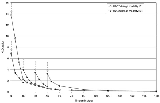 H2O2 concentrations monitored during the tests conducted with a lime amount of 15 g/L and by dosing the hydrogen peroxide in a single step (modality D1) and in four additions (modality D4). The arrows indicate the H2O2 additions.