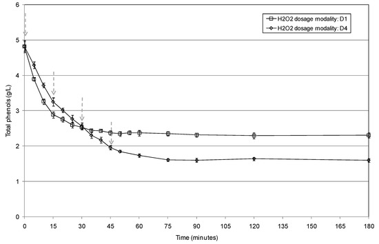 Phenols concentrations monitored during the tests conducted with a lime amount of 15 g/L and by dosing the hydrogen peroxide in a single step (modality D1) and in four additions (modality D4). The arrows indicate the H2O2 additions.