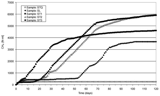 On the contrary, of the negligible production detected with fresh waste, notable digestion performances were observed on pre-treated samples (Figure 6). In particular, on the mixture with the WOMW treated using H2O2 and the greatest lime amount (sample ST3), the exponential CH4 production started almost immediately, without that an acclimation phase was necessary (Figure 6). This was due to the properties of this sample, which had the lowest phenols amount and the highest VFA concentration (Table 4). Furthermore, the VFA amount was also balanced by adequate alkalinity values as results from the VFA/ALK ratio [39]. These characteristics clearly promoted the immediate methane production. Nevertheless, in this case, the conversion of organic matter, of about 64%, was lower than those obtained on samples with H2O2 and lime dosages of 15 g/L (sample ST1) and 25 g/L (sample ST2) (Table 5, Figure 6 and Figure 7). This is likely attributable to a remarkable incorporation of organic matter by the greatest lime amount (35 g/L), which hindered the methane production. In fact, a cumulate volume of approximately 4.6 L was reached.