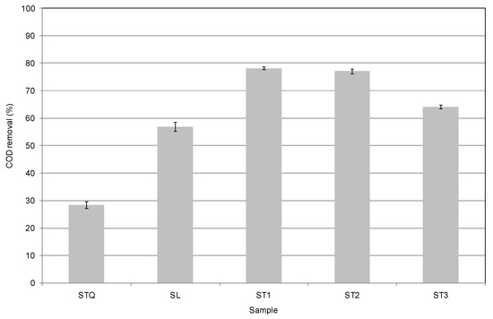 From the analysis of experimental results (Figure 6), it can be noticed the very low methane production for the mixture with untreated WOMW (STQ). In fact, although the pH of the waste was corrected to prevent initial acidic conditions (Table 4), only a methane volume of about 260 mL was detected (Figure 6). This negligible production confirms the extremely low anaerobic biodegradability of raw wet olive mill wastes [31]. Indeed, in the mixture with untreated sample, the high phenols concentration probably caused the arrest of AD process. Thus, the findings of conducted tests indicate that an effective biogas generation is hardly detectable on WOMW, also if the mixture were prepared using suitable inoculum quantity, equal to 45% of the overall amount. Consistent with the poor methane production, a small COD abatement, of about 29%, was monitored at the end of anaerobic digestion (Figure 7). These findings are in agreement with the statements of other researches, which indicated that the CH4 generation could be possible exclusively with extremely high dilution ratio of raw olive mill residues [37,38]. However, this workaround is not applicable for olive milling plants that cannot mix the WOMW with other types of waste. Furthermore, the high amounts of olive mill by-products that are commonly produced in a very restricted period cannot be easily stored. Thus, it is important to treat high WOMW quantities in a short time.