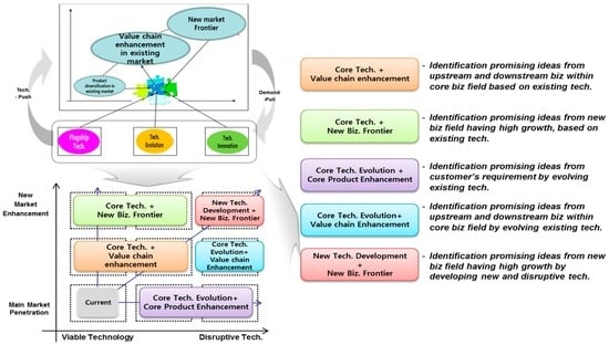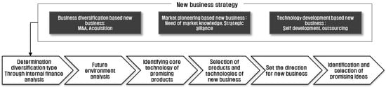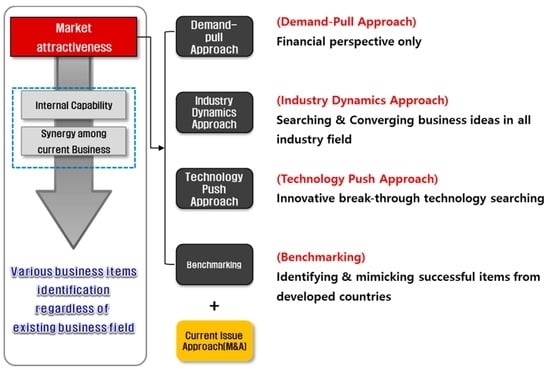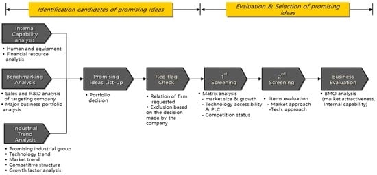 In the identification stage, promising new business items are listed up based on analysis of internal capability, analysis of industrial trend, and benchmarking [,]. In screening process, market size, growth potential, and technology accessibility among others are prioritized. Through a communication with the requesting firms, only a handful of items are selected. The final and evaluation stage determines whether the candidates have enough market attractiveness and internal capability [].