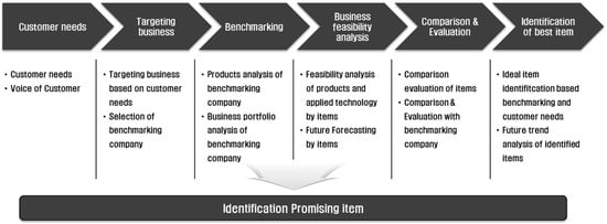 The searching process of promising business items is divided into identification of promising business items and evaluation and selection of the derived items. The first step relates to the internal capability of analysis of the firm and includes a management capability analysis and business portfolio analysis within the firm. To target the industrial sectors of interest, the firm performs a market and technology trend analysis of the target industry. Additionally, this step lists the emerging business items of a requesting firm through a benchmarking analysis targeting similar international firms that examine new business sectors, their sales and R&D analyses, and their main business portfolio sectors. In the evaluation and selection stage, we select the final promising business items from all ideas listed in the previous stage conducting a technology and market analysis, a screening procedure for evaluating the promising ideas, and an in-depth analysis of the business value of such ideas. The detailed steps for identifying promising business items are as shown in Figure 6.