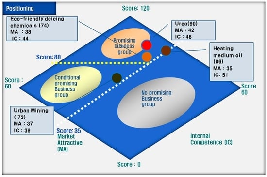 Both the marketing experts for market feasibility analysis and industry experts for the technology accessibility analysis participated in the BMO analysis. As shown in Figure 8, the analysis results showed that urea, eco-friendly deicing chemicals and heating medium oil belong to the “promising business group”, and urban mining belongs to the “conditional promising group”.