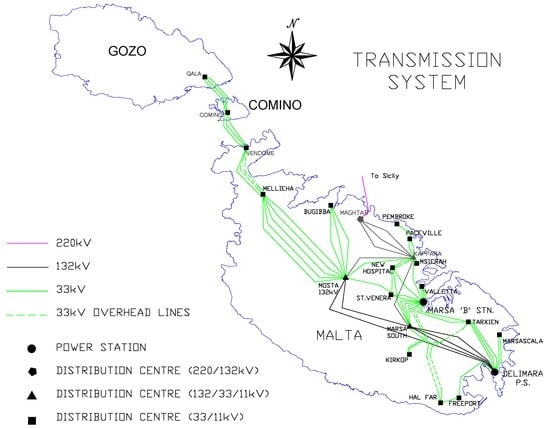 The Enemalta Corporation (EMC) (City, Country) is the owner of all Maltese thermoelectric power plants [23]. Electrical energy is mainly generated at the Delimara Power Station (with an installed power of 444 MW), located on the southeastern part of Malta. The power station is composed of conventional steam turbines (2 × 60 MW), open cycle gas turbines (2 × 35 MW), one combined cycle plant (110 MW) and four stroke medium speed diesel engines (144 MW, operating in a combined cycle mode with one steam turbine). In the past, another important plant was installed at the Marsa plant (with an installed power of 155 MW, 2010), but, nowadays, is in a decommissioning phase [23]. Therefore, the total traditional installed capacity was about 599 MW, while the renewable power plants capacity does not exceed 14 MW [24]. In Figure 3, the electric grid of the archipelago of Malta is shown.