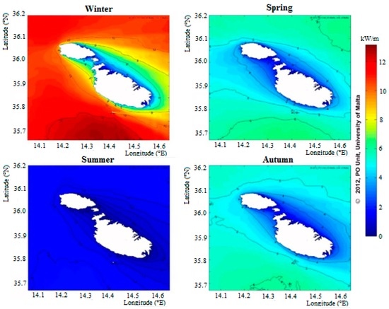 Finally, the annual average wave power must be multiplied by 8760 h (hours in one year) in order to have the total energy, expressed in MWh/year. The next step consists in the use of the SWAN (Simulating Wave Nearshore) model hindcast three-hourly fields, which is characterized by 89,701 grid point around the Maltese islands [29]. This model is particularly advantageous with propagation problems from deep water up to the coasts. Both buoy data and SWAN data have highlighted an important seasonal variability of sea wave power along Maltese coasts. Wave power is characterized by high values during winter season, which decrease in autumn and spring, while the minimum values are recorded in summer. Moreover, winter wave power is more than double the annual average, visible in Figure 6 and obtained from the data reported in [29].