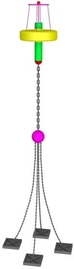 A hemispherical weight is installed in the lowest part of the central buoy, guaranteeing good stability to the system and its vertical position. This hemispherical weight is connected to a jumper (purple sphere) through a big chain, while the same jumper is connected to four moorings, placed on the seabed. In this way, the four chains connecting moorings and the jumper are constantly maintained in a vertical position, avoiding the risk due to the scraping of the seabed [34]. An intermittent red light is positioned on the top of the buoy, making visible the WEC up to several nautical miles away. The capture buoy has a useful diameter of 5 m, while the working stroke of the generator is about 4 m. This length also allows the production of electricity in most agitated and energetic sea states.