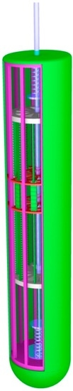 The DEIM converter proposed here has a nominal size of 80 kW. In order to reduce the designing and developing costs for different sizes of systems, a modular approach is applied. In fact, the electrical converter is made from eight linear generators, each one with a nominal size of 10 kW. It consists of two floating buoys, independent of each other [33]. The external one (yellow buoy) intercepts the sea waves, while the internal one (green buoy) contains all of the eight linear generators. The alternate motion of the sea waves is transferred from the external buoy to the internal one thanks to the connecting rods (pink rods).