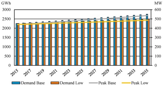 Projections until 2035 of Maltese electrical energy requests and peak requests [28].