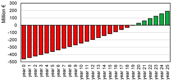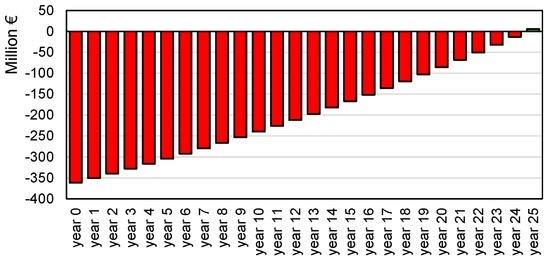 Using Equation (2), Figure 11 shows the Discounted Cash Flow, assuming the realization of the wave farm without the integration of solar photovoltaic. According to this evaluation, the breakeven time is estimated to be equal to 24–25 years, as shown in the following figure.