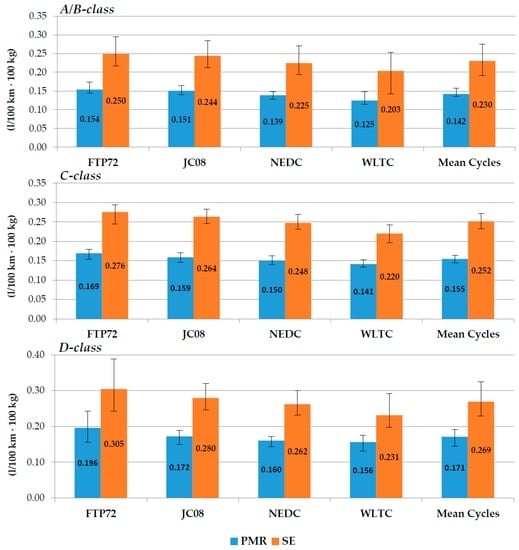 Figure 2 reports the arithmetic mean of FRV within the class per driving cycle: the black bars identify the maximum range of variation around the mean.