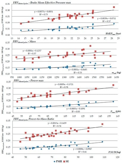 Dependence of FRV on vehicle technical features. This paragraph aims to establish if any correlation between the values of FRV and the main vehicle technical features exists. The parameters taken into account are maximum Brake Mean Effective Pressure (BMEPmax), vehicle mass (mveh), maximum Power (Pmax) and Power-to-Mass Ratio (P/M). The existence of any correlation is investigated through the analysis of regression lines of FRVPMR and FRVSE in function of BMEPmax, mveh, Pmax and P/M. Figure 3 reports regression lines and corresponding coefficient of determination for FRVMeanCycles.