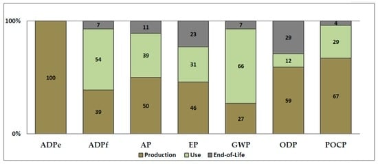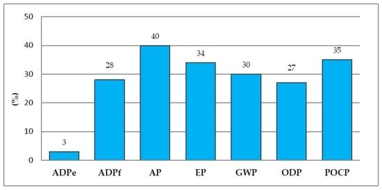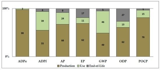 Figure 4 reports total LC impact of lightweight solution expressed as percentage of the one of reference solution. Results show that lightweight solution involves a notable reduction of the AIM LC impacts. The highest reduction (40%) regards AP, while, for ADPe, the benefit is negligible (3%); the other categories present reductions that range between 27% and 35%. Figure 5 and Figure 6 report contribution analysis by LC stage of potential environment impact, respectively, for polyamide and polypropylene composite AIM. Data show that the change of construction material causes a notable growth of use stage quota for the majority of impact categories (15%–20%), totally to the detriment of production. This fact can be explainable through the minor energy intensity of polypropylene composite production processes despite the lower mass. EoL quotas present a moderate increase (maximum increase is 6% for EP).