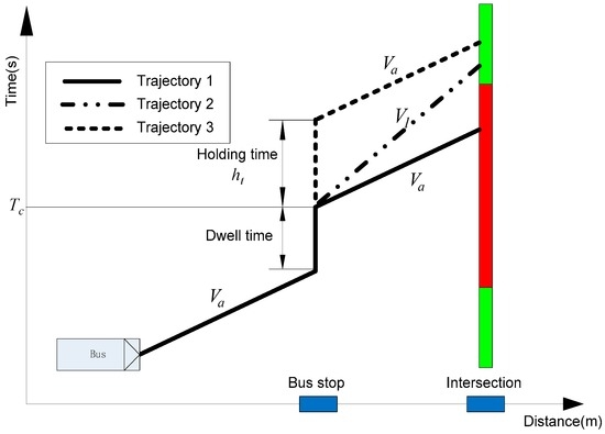 The basic idea of the proposed model is illustrated in Figure 2. Trajectory 1 is the normal trajectory for buses. After boarding and alighting the passengers, the bus closed the door and is ready to depart from the bus stop at time . Then the bus will accelerate to , joining the queue formed by the red light. Trajectory 2 stands for the bus operation strategy with speed control. In this case, the bus also departs from the bus stop immediately at , but it will accelerate to a relatively lower speed ; then it can clear the intersection without stopping again. Trajectory 3 represents the bus operation strategy with holding control. By holding the bus seconds at the bus stop, then the bus can also clear the intersection without another stop.