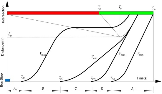 Transit signal priority (TSP) is another promising option to give priority to buses. With TSP, buses can request the green phase of traffic signals to claim the right-of-way and proceed unimpeded through an intersection [30]. Many studies have proposed TSP strategies and documented the benefits of TSP implementations [31,32,33,34,35,36,37,38]. However, most existing methods for transit signal priority are proposed assuming that the TSP system has no holding control, and that the speed of buses are given as constant [31,39]. However, in reality, firstly, holding control can determine bus dwell time at bus stops significantly, thus causing deviations of the bus arrival time at the stop line. Even small deviation of bus arrival time may result in low TSP efficiency, or even TSP system failure. Secondly, real-time bus speed is a function of several factors, including bus driver behavior, bus characteristics, impacts of upstream signals, and traffic conditions even with an exclusive bus lane [40]. Moreover, most existing references concerning TSP focus on optimize signal timing to reduce congestions, but fuel consumptions and pollution emissions are also important sustainable parameters to evaluate the benefits of TSP.