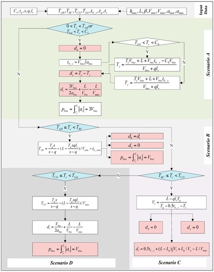 The minimization is a nonlinear programming problem, which is programmed in Microsoft Visual Studio C++ (Redmond, WA, USA) to solve it in our study. The C++ optimization flow chart of the proposed method, including the four scenarios and the aforementioned formula, is shown in Figure 4. Note that in scenario B, the bus delay is computed in the same way as for scenario C.
