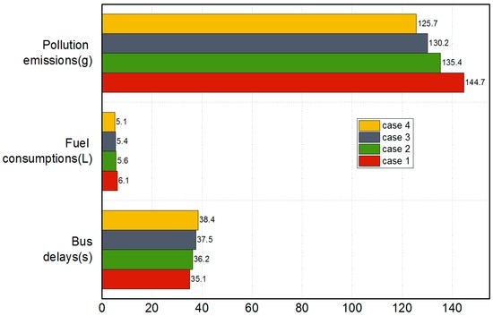 To further verify the performance of the proposed model in a more realistic scenario, a simulation test by PTV VISSIM 5.3 (Karlsruhe, Germany) is employed. VISSIM is a worldwide traffic and transportation simulator, which can simulate the stochastic nature and detailed interactions of traffic flows. In the simulation, bus frequency was set to 30 veh/h, the other parameters are kept the same with the above statement. The VISSIM COM interface is employed to implement speed control and holding control. Every parameter combination is simulated 20 times under different random seeds. The simulation lasts 4200 s each time. Performance data will be collected from 900 s to 4200 s, while 0 s to 900 s will be used to warm up the simulation. After the simulation test, the performance data, including bus delay, fuel consumption, and pollution emissions, are collected. The results are illustrated in Figure 5.