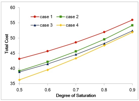 Figure 6 displays the performance results in the different cases under different degrees of saturation. The total cost is computed by Equation (1).