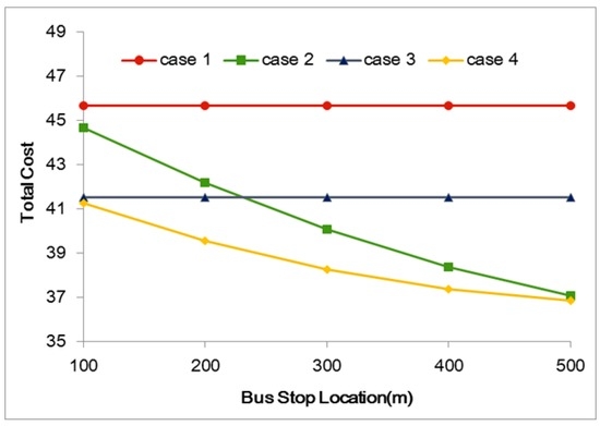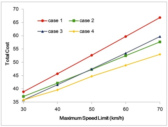 Since increases, the travel delay will increase. However, with the increase of the maximum bus speed, the bus could proceed with a higher speed, which can expand the bus service rate mentioned in Equation (28). Additionally, the proposed method (case 4) will outperform all other cases with the smallest cost.