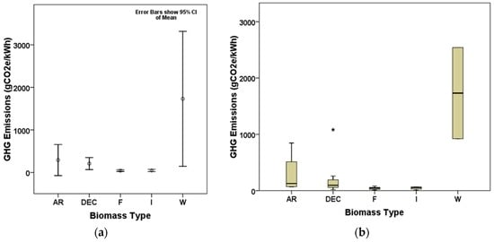 GHG emissions from biomass-only electricity generation systems: (a) mean ± 95% confidence interval (CI) error bars and (b) quartile box plots.