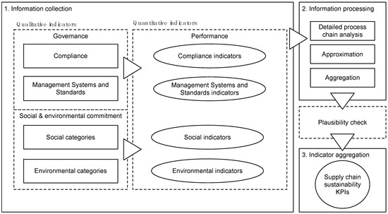 Since a supply chain-wide perspective is essential for improving the sustainability performance of organizations and products, Schöggl et al. [12] suggest making use of the Assessment of Supply Chain Sustainability (ASSC) framework, as illustrated in Figure 1. This framework first provides the foundation for assessing the social, environmental and governance aspects of sustainability with the aid of qualitative and quantitative indicators (1. Information collection in Figure 1). Second, it encompasses different methods for processing (2. Information processing) and aggregating (3. Indicator aggregation) suppliers’ sustainability information into supply chain sustainability key performance indicators (KPIs) (see Schöggl et al. [12] for more details). The ASSC framework, which was developed with the help of industrial experts from the European automotive and electronics industries, does not, however, encompass a definite set of supply chain indicators, since these indicators cannot be defined globally. As Clift [22] or Courville [23] state, such supply chain sustainability indicators must be developed on a case by case basis, meaning that for specific industries or even for specific organizations, specific indicators have to be used. Therefore, in this paper a set of qualitative and quantitative supply chain sustainability indicators is developed specifically for the European automotive and electronics industries. These indicators were developed after the ASSC framework was conceptualized in order to illustrate how indicators can be integrated into the framework while taking account of industrial requirements, as outlined in Section 4.3.1.